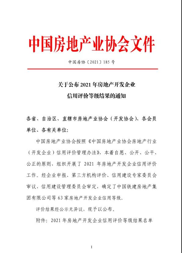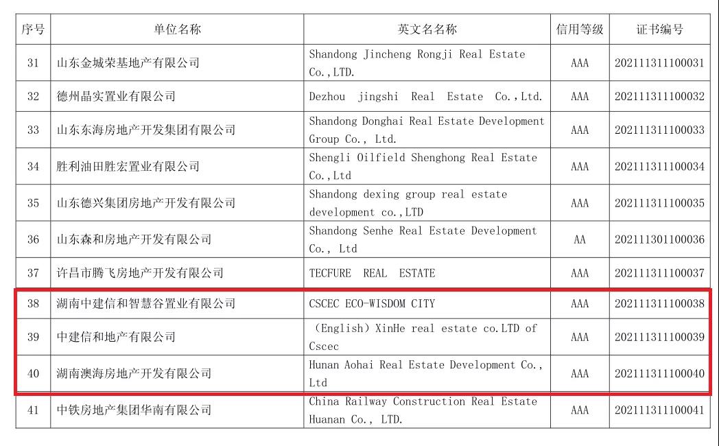 12月29日,中國房地產(chǎn)業(yè)協(xié)會公布2021年信用等級AAA房地產(chǎn)開發(fā)企業(yè)名單,我會會員單位中建信和地產(chǎn)有限公司、湖南澳海房地產(chǎn)開發(fā)有限公司、湖南中建信和智慧谷置業(yè)有限公司獲得“2021年信用等級AAA級房地產(chǎn)開發(fā)企業(yè)”評價。