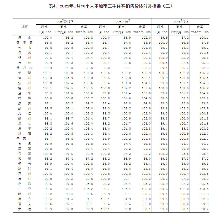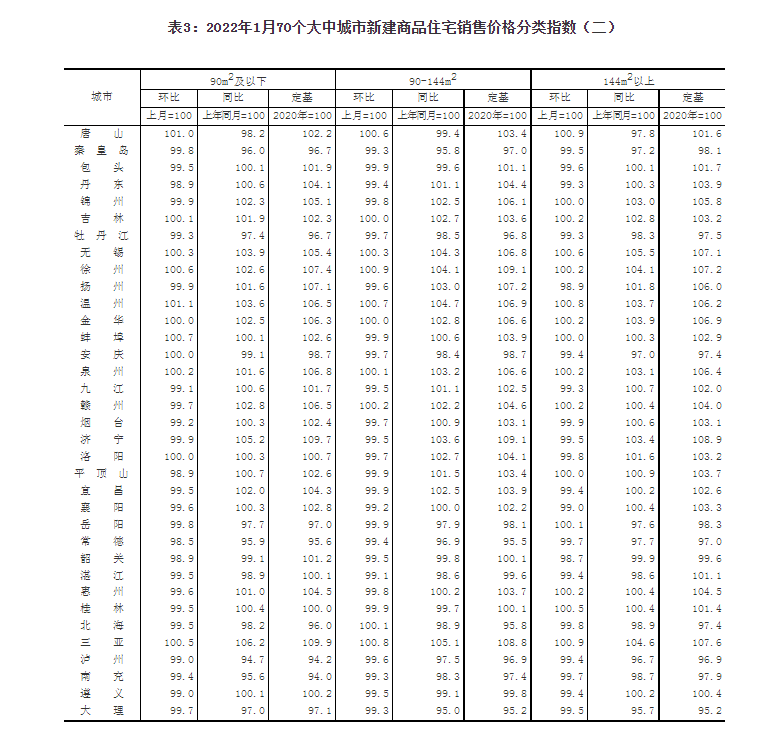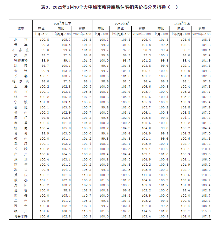 2022年1月份70個大中城市商品住宅銷售價格變動情況
