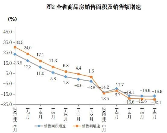 上半年,全省商品房銷售面積3653.73萬平方米,同比下降16.9%。其中,住宅銷售面積下降19.3%,辦公樓銷售面積下降12.1%,商業(yè)營業(yè)用房銷售面積增長2.4%。商品房銷售額2307.14億元,下降20.1%。其中,住宅銷售額下降22.7%,辦公樓銷售額下降32.3%,商業(yè)營業(yè)用房銷售額增長3.0%。