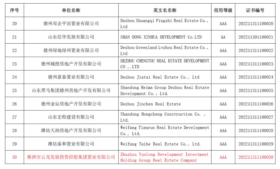 近日,中國房地產(chǎn)業(yè)協(xié)會公布2022年房地產(chǎn)開發(fā)企業(yè)信用等級結(jié)果。2022年全國房地產(chǎn)開發(fā)企業(yè)獲得信用等級共有43家。在湖南省房地產(chǎn)業(yè)協(xié)會的組織和推薦下,株洲市云龍發(fā)展投資控股集團置業(yè)有限公司獲得信用評價AAA等級。