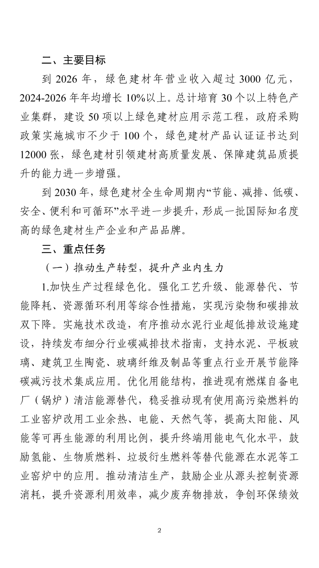《方案》提出,到2026年,綠色建材年營業(yè)收入超過3000億元,2024-2026年年均增長10%以上。總計培育30個以上特色產(chǎn)業(yè)集群,建設(shè)50項以上綠色建材應(yīng)用示范工程,政府采購政策實施城市不少于100個,綠色建材產(chǎn)品認(rèn)證證書達(dá)到12000張,綠色建材引領(lǐng)建材高質(zhì)量發(fā)展、保障建筑品質(zhì)提升的能力進一步增強。