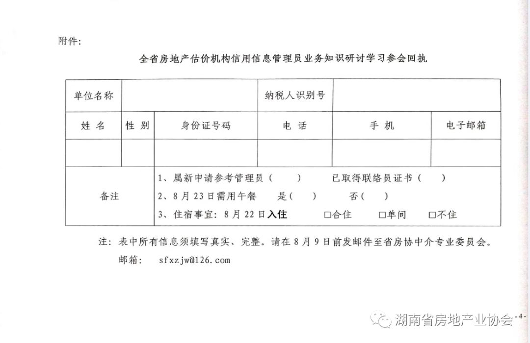 3、各機構收到通知后,及時確定專職管理員。同時將參會回執于8月9日前發郵件至湖南省房地產業協會中介專業委員會郵箱(sfxzjw@126.com)。
