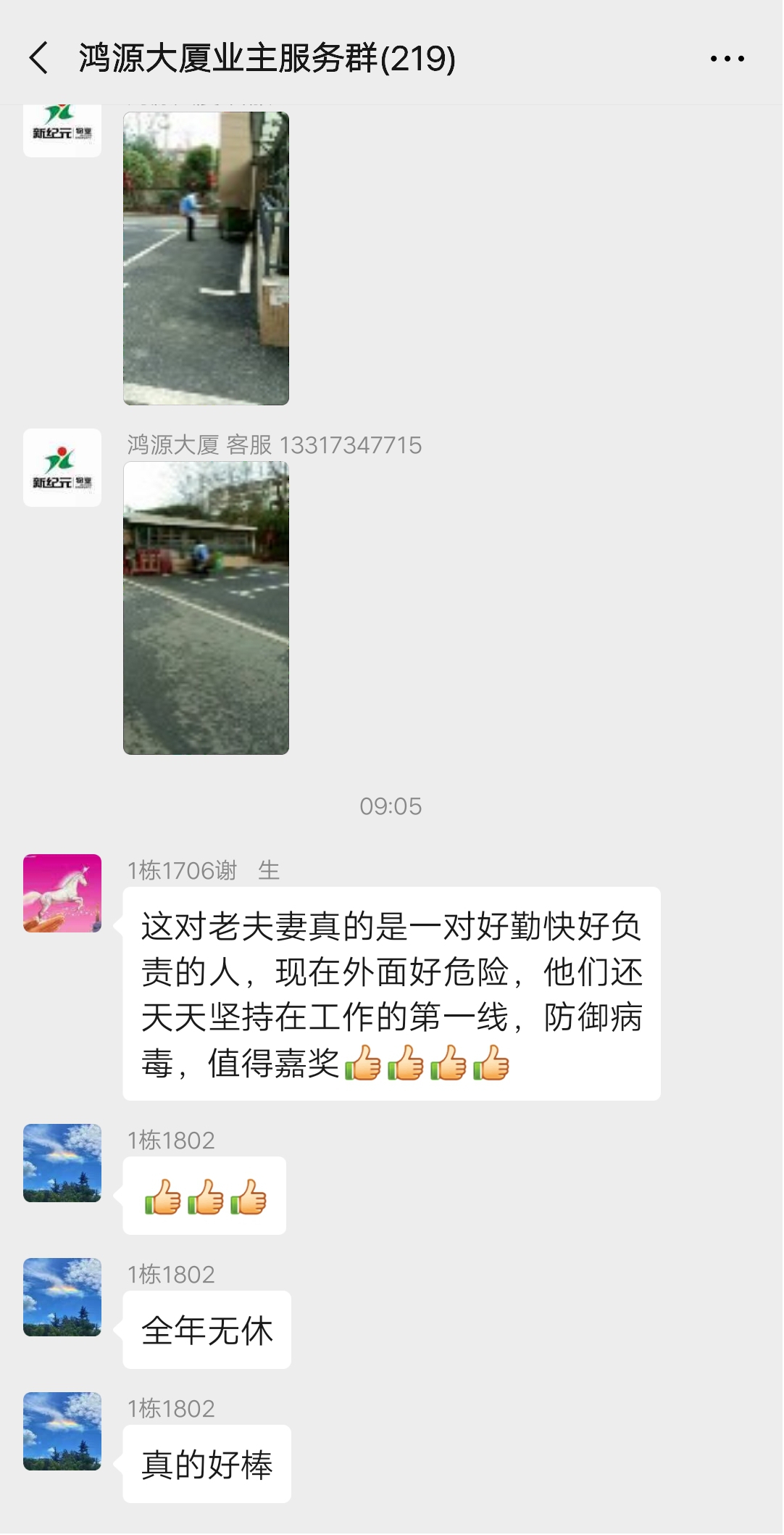業主小區時看見你忙碌的身影,戴著口罩,站在寒風刺骨中,堅守在抗病毒第一線,深深地感動了全小區的住戶,在國家處在水深火熱中是你們千千萬萬個基層工作者,在默默無聞地無私奉獻著,夜里加班一兩點,早晨還要去執勤,誰沒有家,誰沒有孩子!誰沒有父母,是你放棄了春節合家團聚,聽黨的一聲召喚,你就奮不顧身地沖到了第一線,小區安危有你的功勞,小區的平安有你功勞。只有你,小區的業主在家才能過個“安心,有你在我們踏實的過新年!謝謝你!無論是社區居委會干部,還是小區物業,他們向業主展示的親情可能不同,但是他們給鴻源大廈全體業主帶來的無私奉獻情、志愿值守情卻是那么相同。眾志成城,團結一心,有了他們,相信,我們一定能夠打贏這場疫情防控人民阻擊戰。