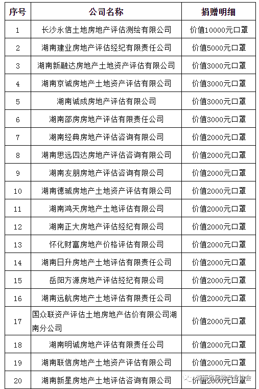 在湖南省房協中介專業委的號召下,各中介機構積極響應倡議,紛紛解囊相助。截止2月14日,省房協收到我省中介機構的捐贈情況具體如下:
