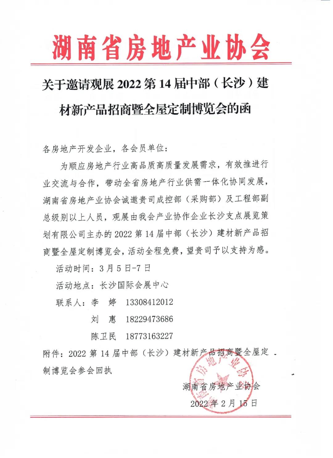 關于邀請觀展2022第14屆中部(長沙)建材新產品招商暨全屋定制博覽會的函