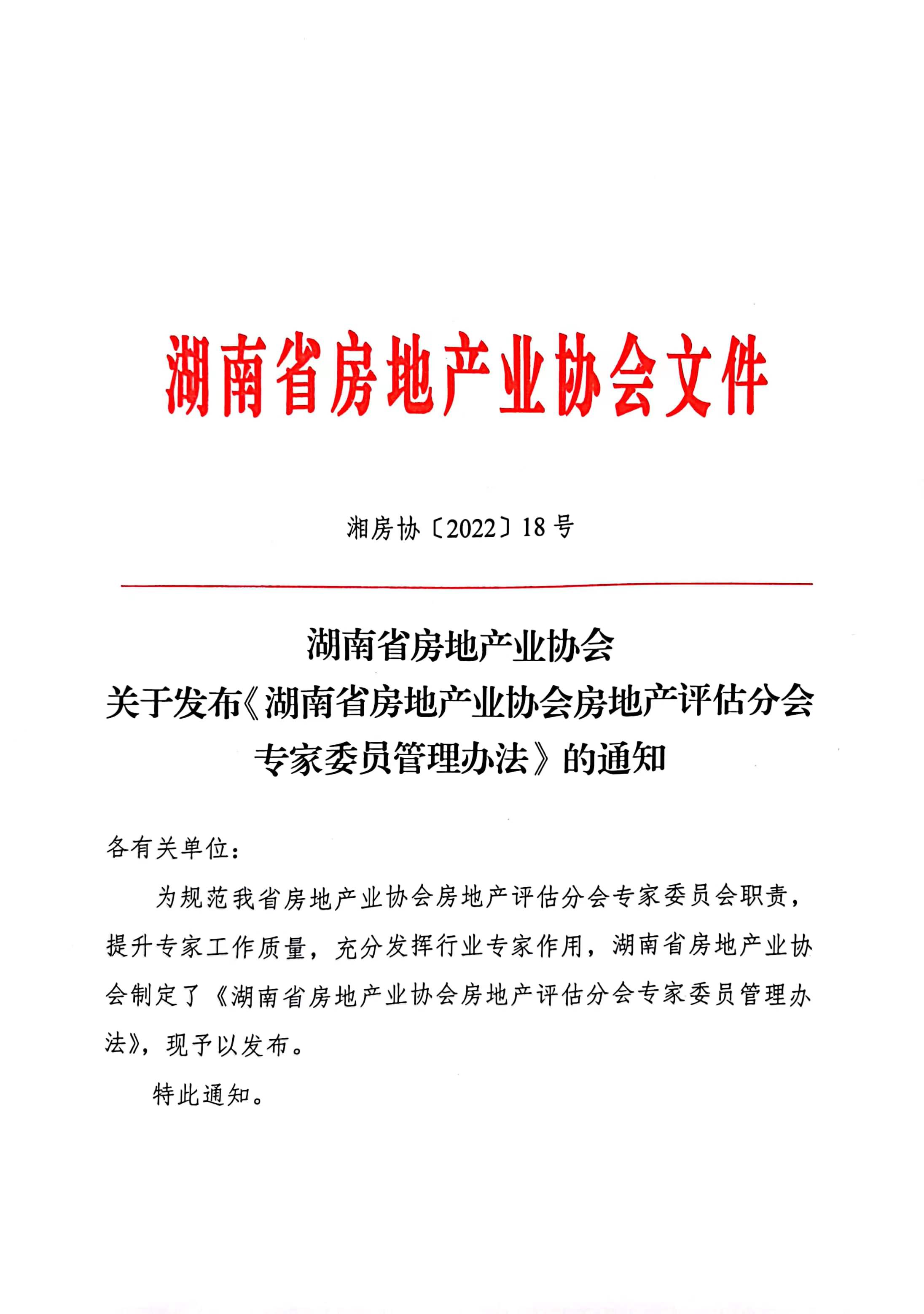 關(guān)于發(fā)布《湖南省房地產(chǎn)業(yè)協(xié)會(huì)房地產(chǎn)評(píng)估分會(huì)專家委員管理辦法》的通知