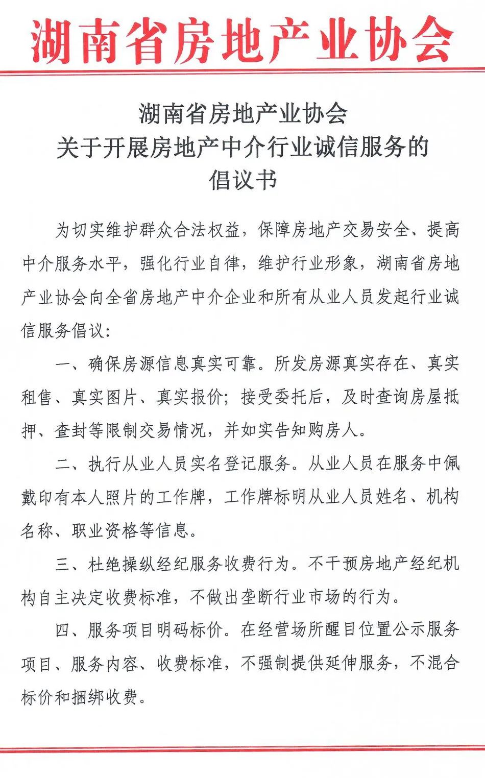 關于開展房地產中介行業誠信服務的倡議書