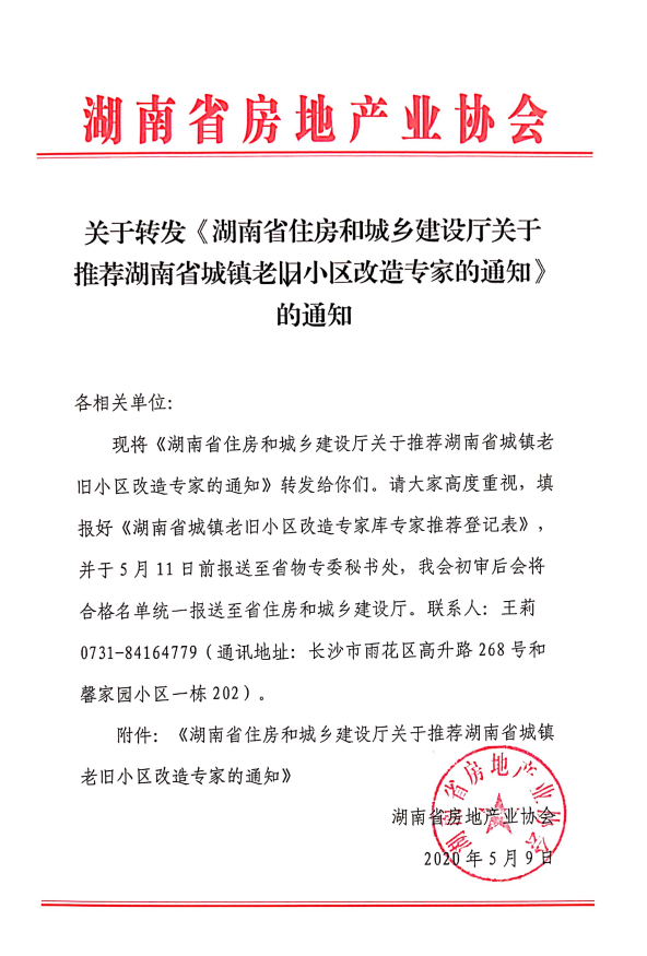 現將《湖南省住房和城鄉建設廳關于推薦湖南省城鎮老舊小區改造專家的通知》轉發給你們。請大家高度重視,填報好《湖南省城鎮老舊小區改造專家庫專家推薦登記表》,并于5月11日前報送至省物專委秘書處,我會初審后會將合格名單統一報送至省住房和城鄉建設廳。聯系人:王莉0731-84164779(通訊地址:長沙市雨花區高升路268號和馨家園小區一棟202)。
